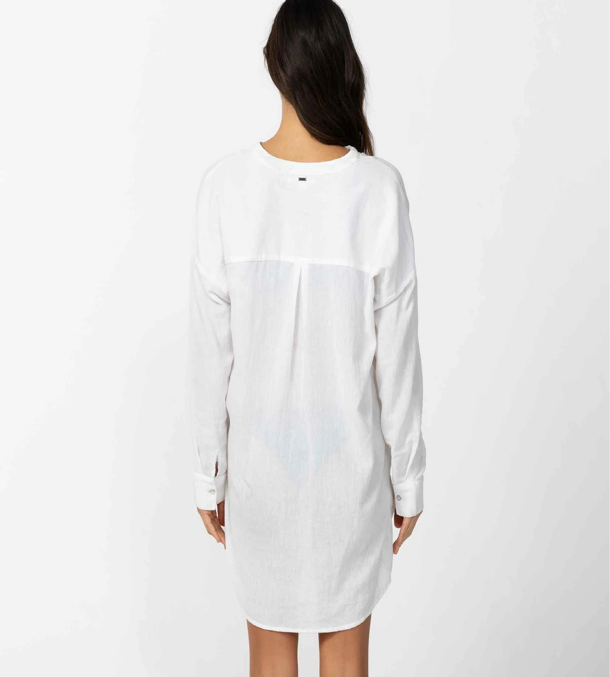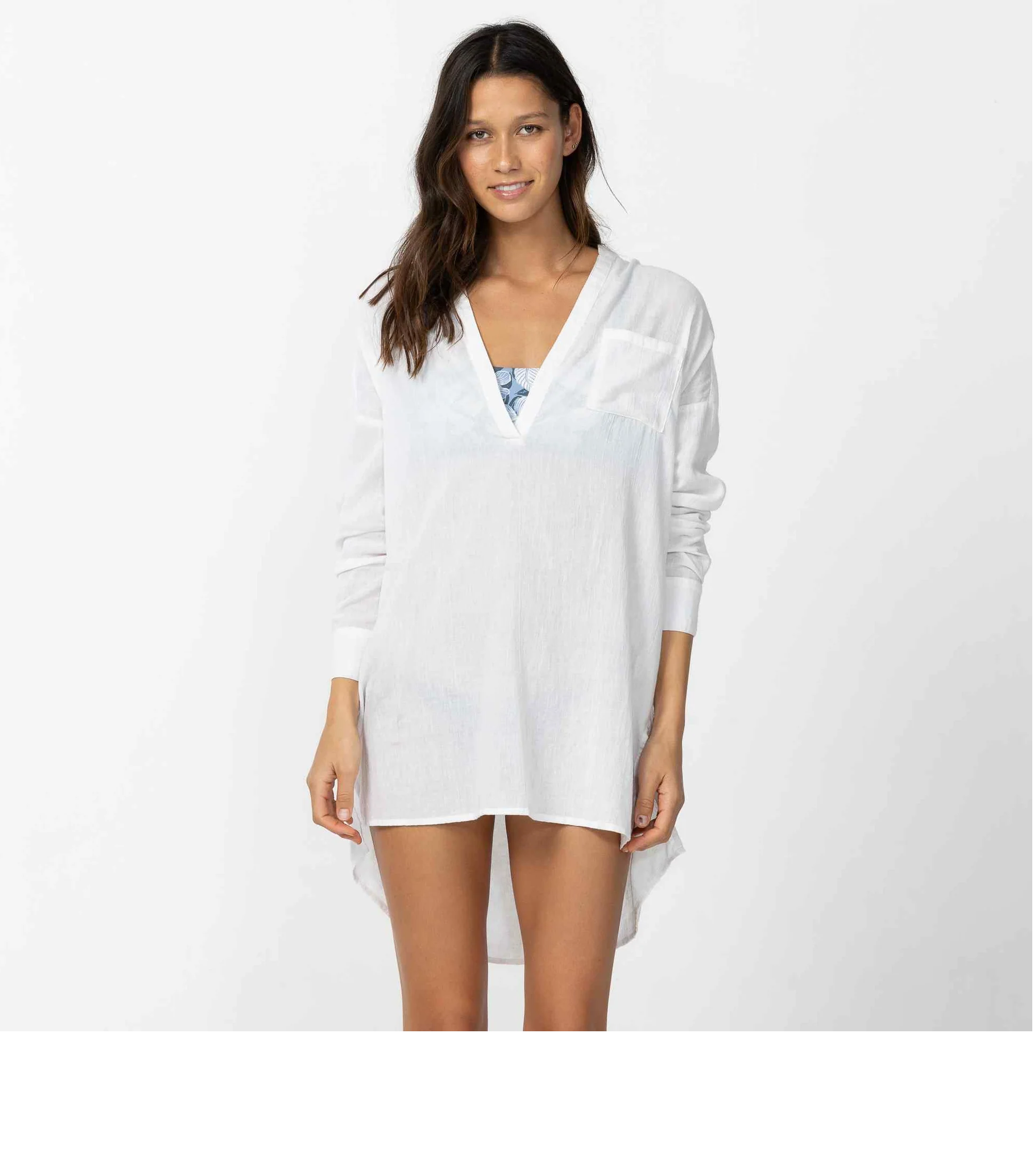 A flowy cover-up to elevate your beach look. It has a long sleeve design, saddle cut hem and v-neckline.