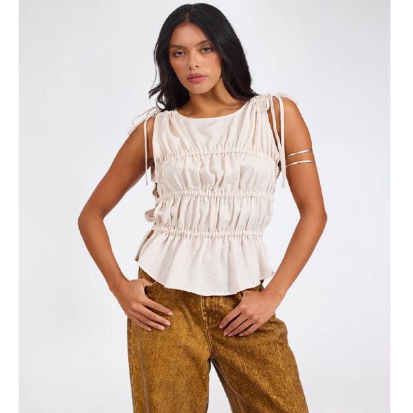 The CREAM EVELYN GATHERED RUCHED TIE TOP combines softness and structure with feminine edge. Elasticated ruching and tie-shoulder straps create sculpted texture.