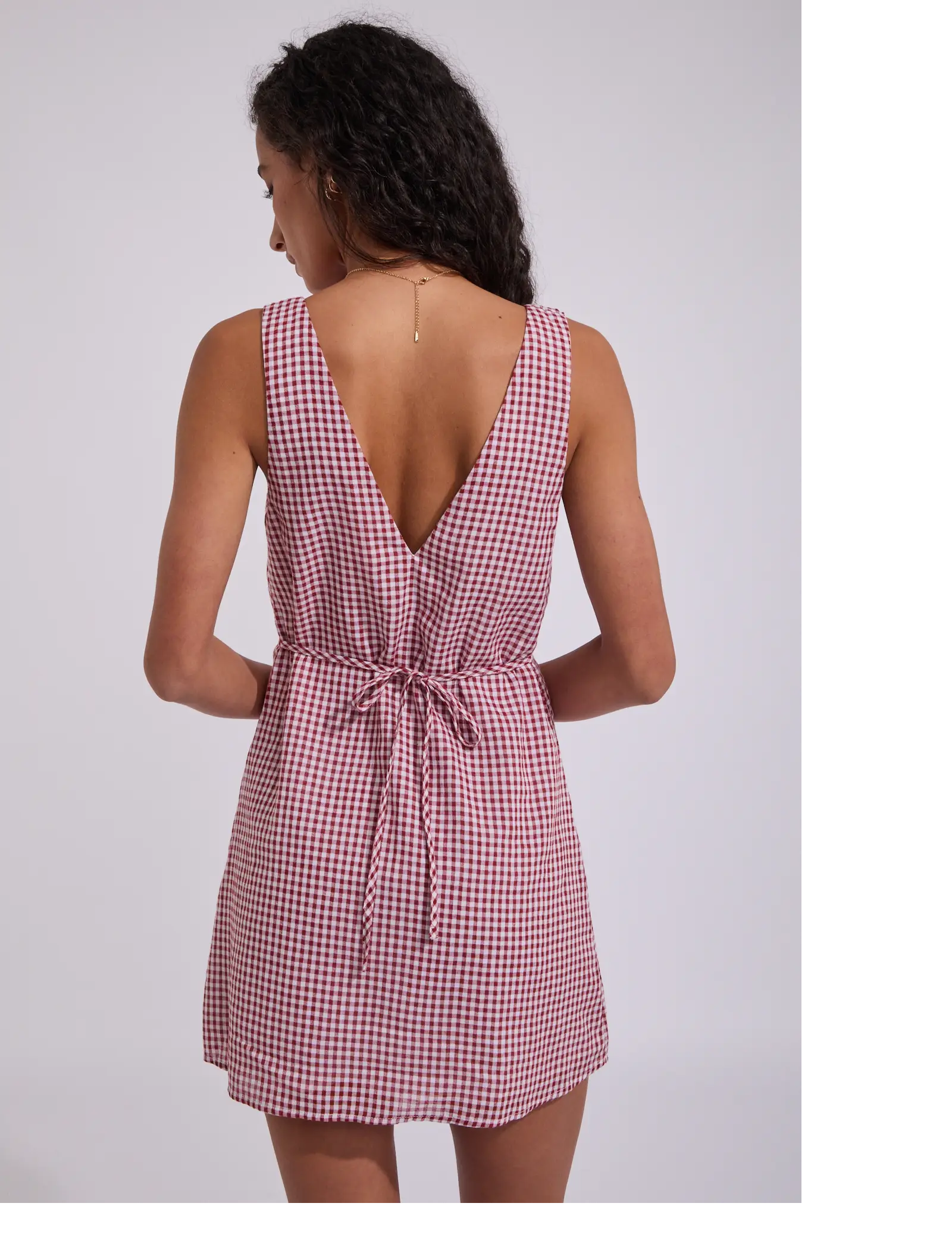 The Lola Check Mini Dress in Fire is a standout piece, featuring a V front neckline with wide shoulder straps. This dress fits slim through the bodice, flowing beautifully at the hemline, complemented by gathering under the bust and a front button placket for added detail.