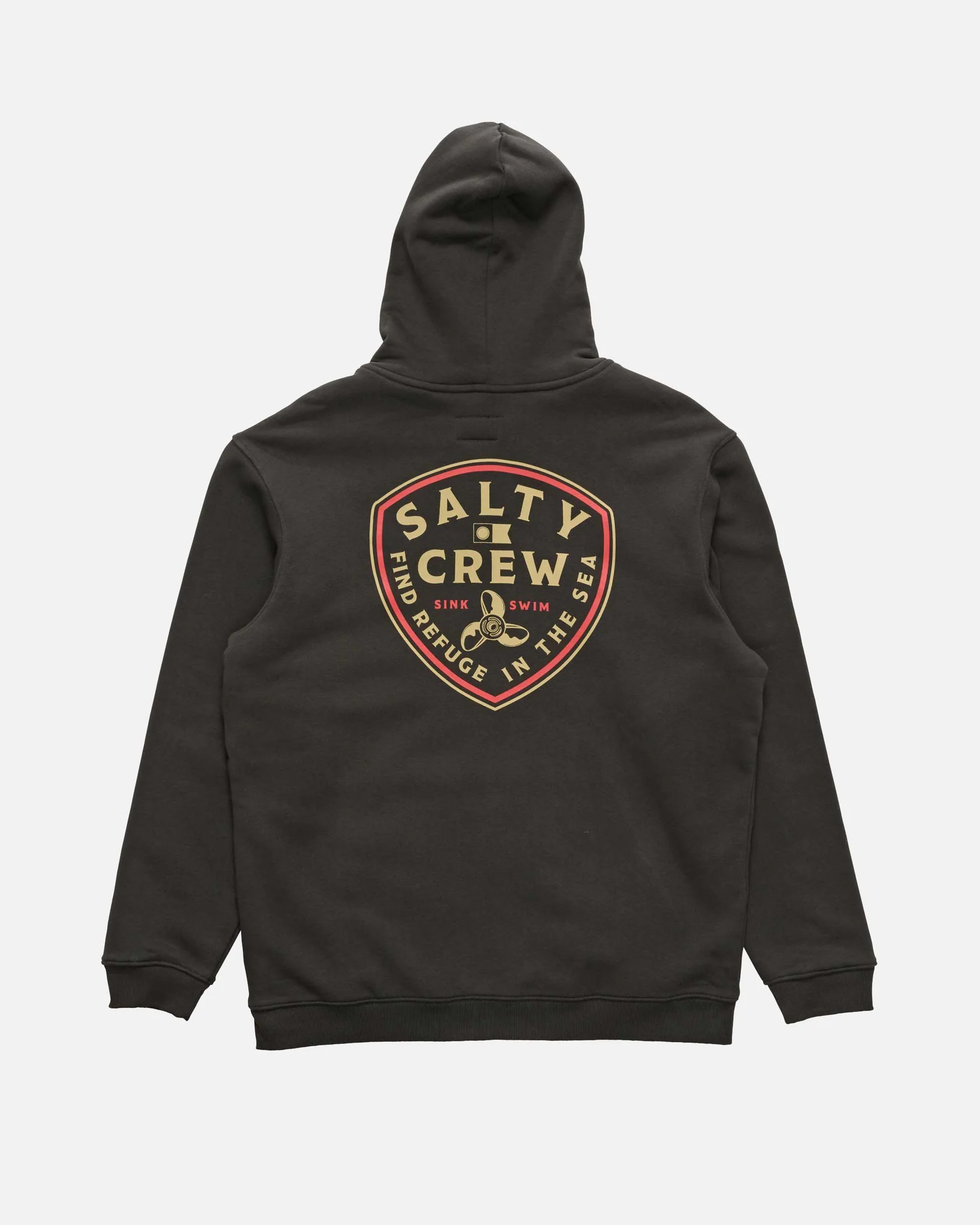 Rotor Fleece Lined Zip Thru in Vintage Black is made from our signature Cotton/Polyester Brushed Fleece, 300gsm in weight. Faux-shearling lined body, two-piece hood with encased drawcord, rib knit cuffs & hem, self-fabric kanga pocket, metal zipper at centre front & Salty Crew clamp label at hood opening. Screen printed front & back prints.