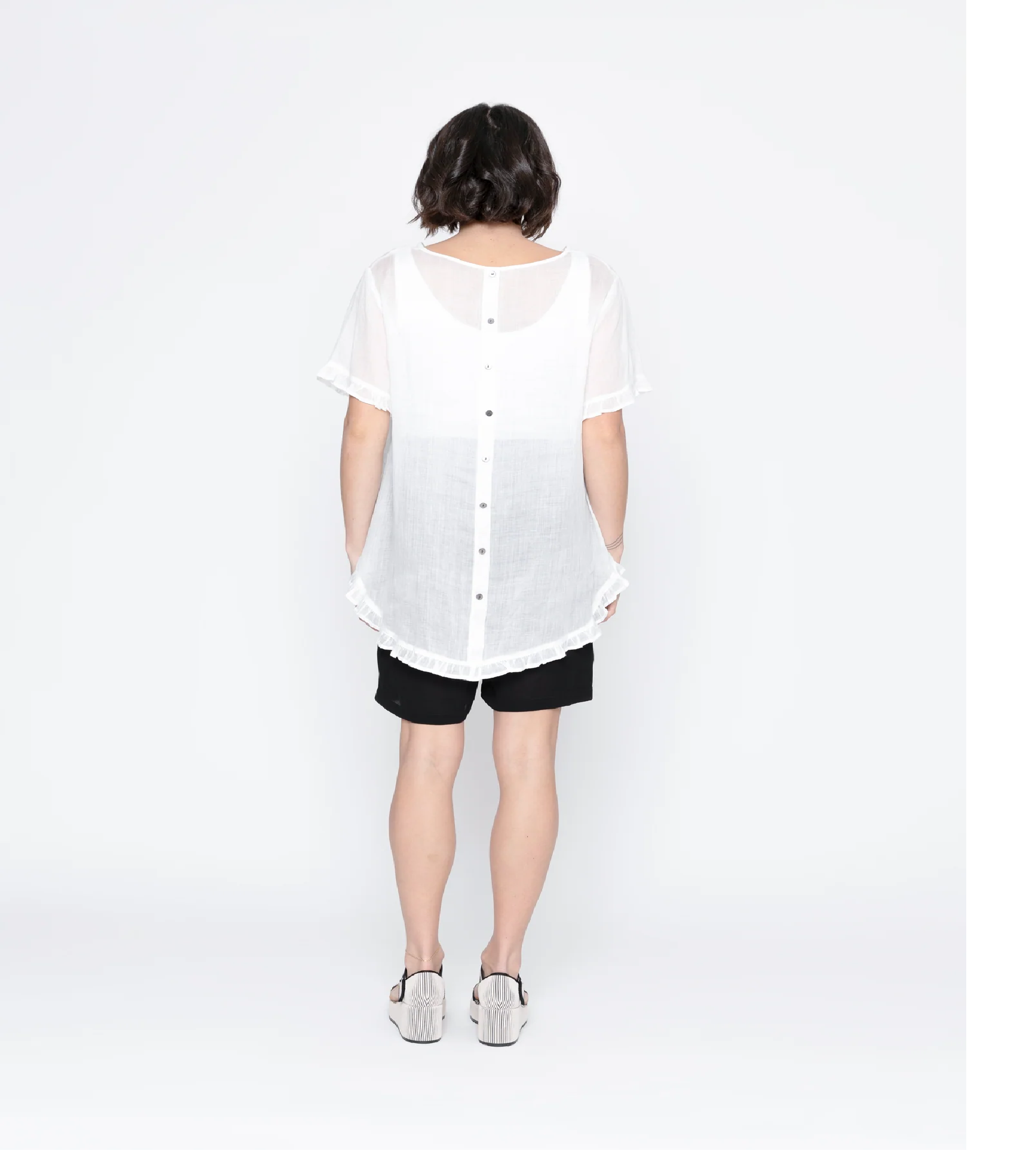 The ruffle high-low hem adds a touch of grace, while the feature back buttons and round neck exude exclusivity. Elevate your wardrobe with this beautifully crafted top, perfect for any upscale occasion.