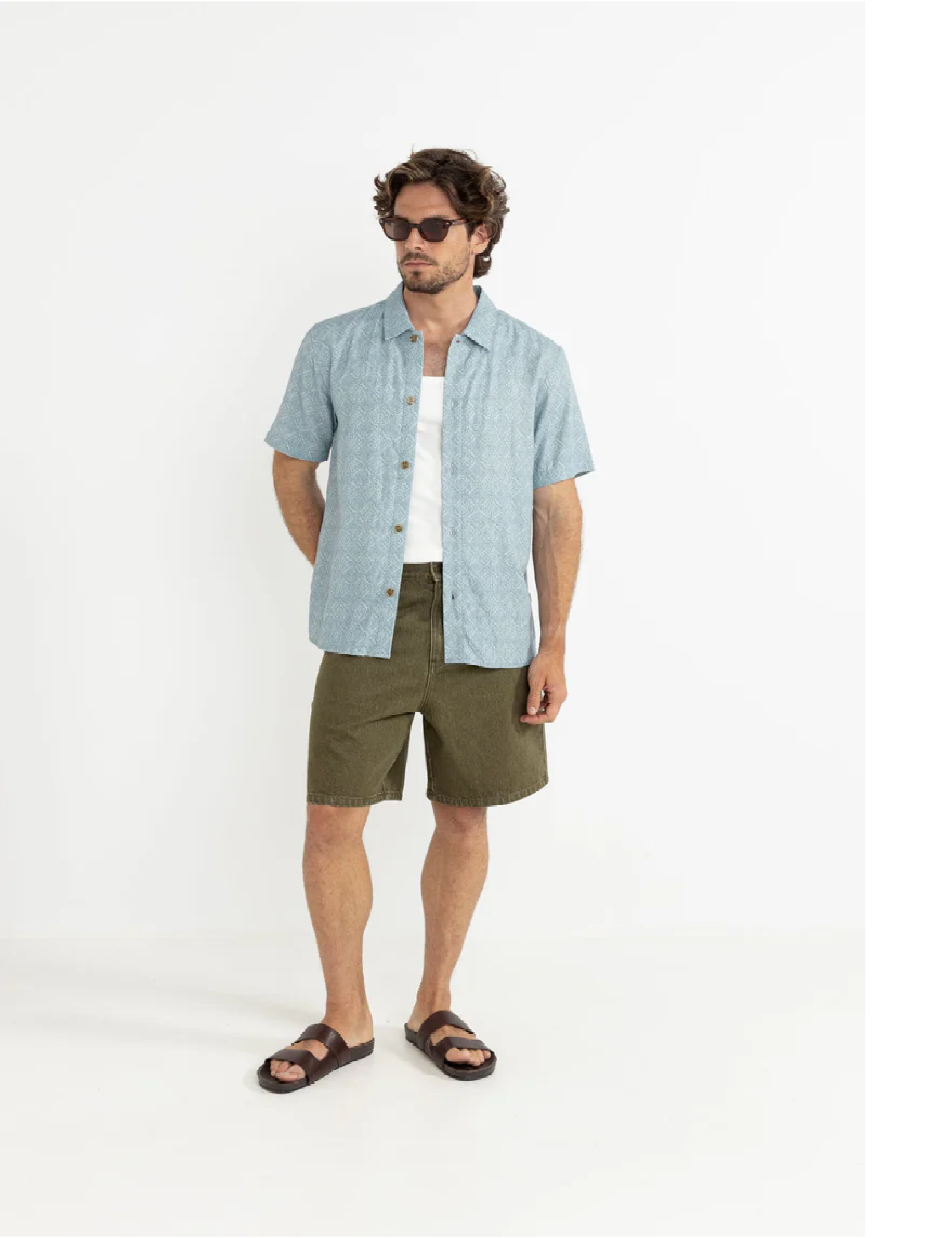With a relaxed silhouette and intricate print, the Tile SS Shirt in Blue is designed for effortless styling. A straight hem and button closure add to its timeless appeal, while Rhythm trims complete the look.